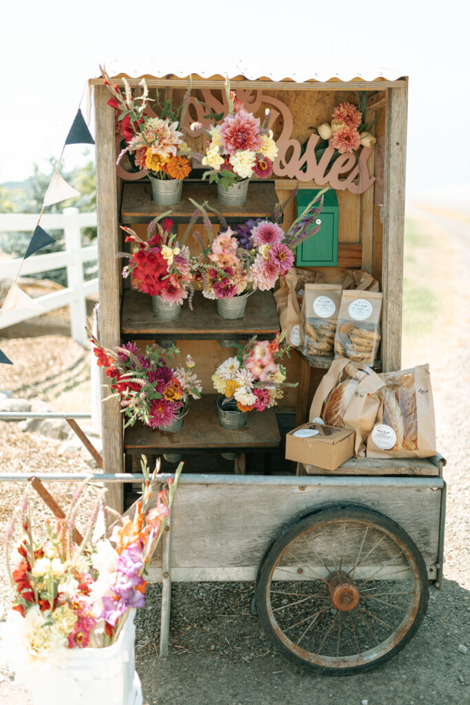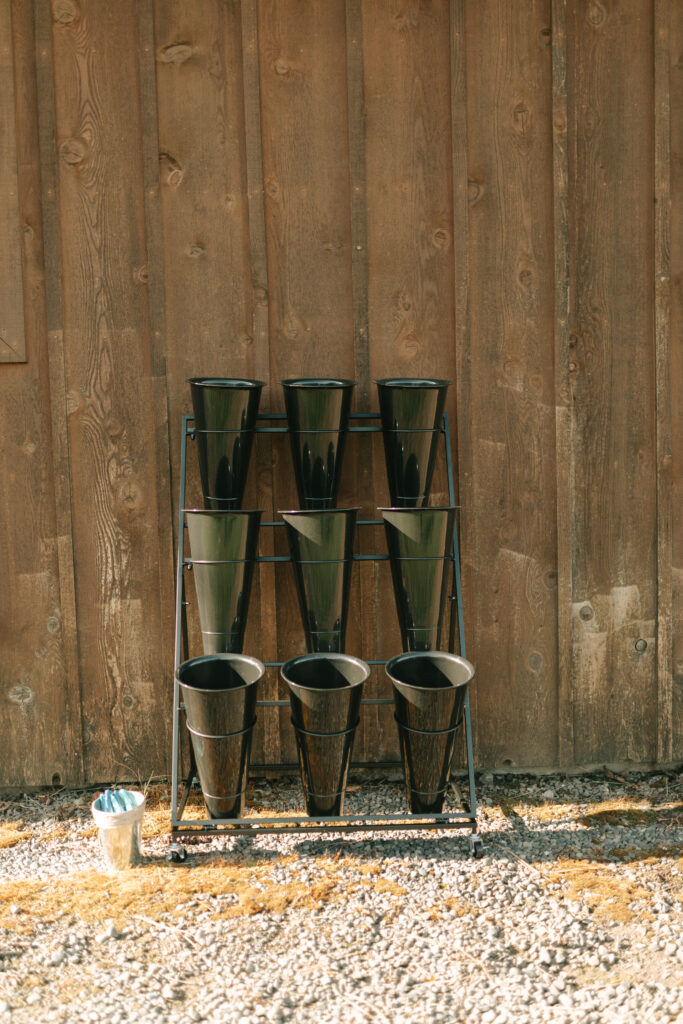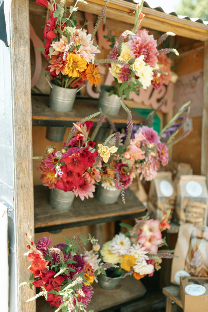 A flower stand with buckets filled with beautiful flowers will be provided for you. The flowers will be sorted into different varieties and colors, ready to be arranged by your guests into bouquets.
